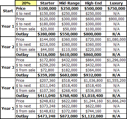 When real estate prices are rapidly increasing, some people believe that the best course of action is to buy whatever they can afford so they can "get on the equity escalator" and "trade up" to a nicer house later. This first chart shows the innefectiveness of that strategy.In the scenario described by the chart below, a starter home costs $100,000, and the cost of all homes is increasing at 20% per year.